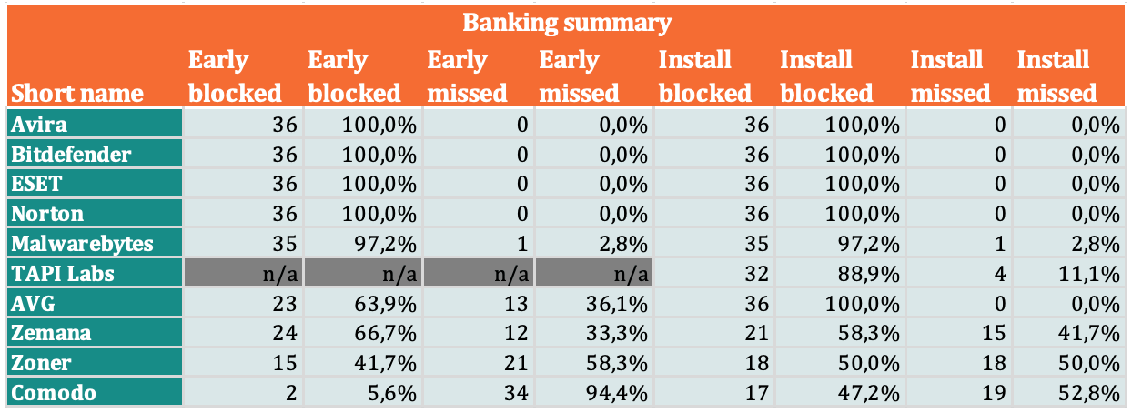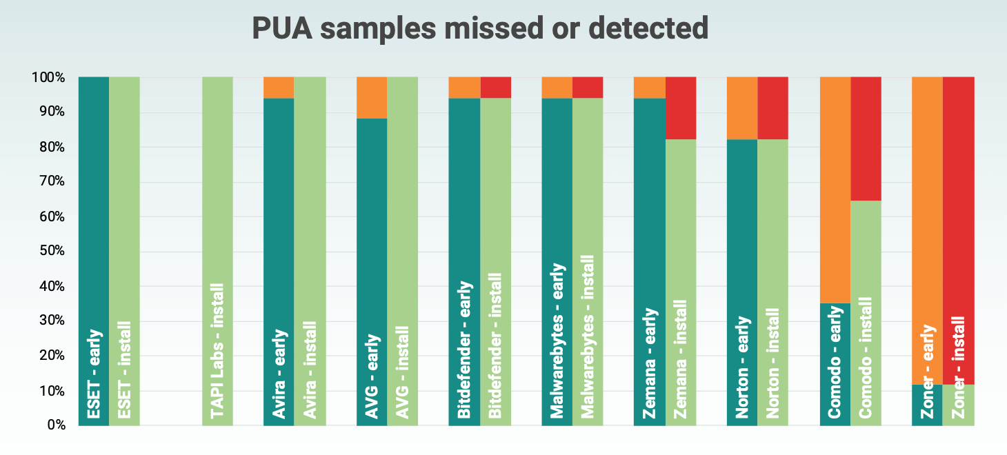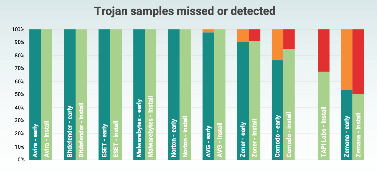 2 Значение задержки (timeout threshold) является критическим аспектом тестирования. Если значение будет слишком низким, результаты теста не будут отражать фактические результаты, так как антивирус не сможет завершить обнаружение. Лаборатория стремится добиться реалистичного значения, поскольку маловероятно, что пользователь ожидает несколько минут после установки, прежде запустить новое приложение, поэтому «слишком позднее» обнаружение или обнаружение без четкого уведомления считается пропуском.