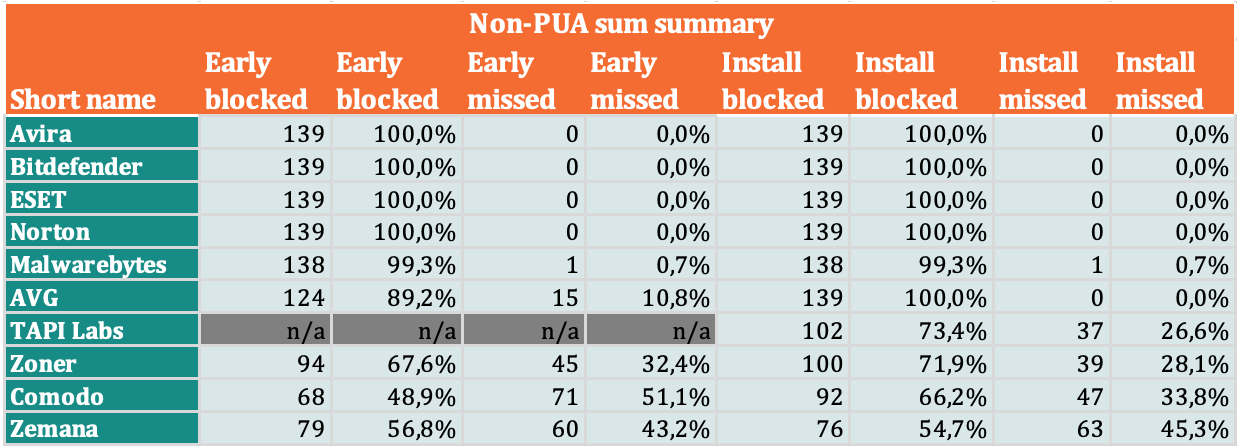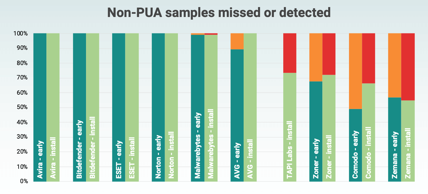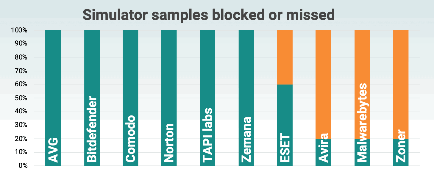 Многие антивирусные движки, которые успешно справились с обнаружением симуляторов в прошлых тестах, на этот раз смогли выполнить обнаружение исключительно на основе признаков сигнатуры пакета. Это означает, что успешное обнаружение было результатом работы механизма, в значительной степени склонного к ложным срабатываниям. Из-за этого в предыдущих раундах тестирования у многих продуктов были проблемы с обнаружением образцов симулятора.