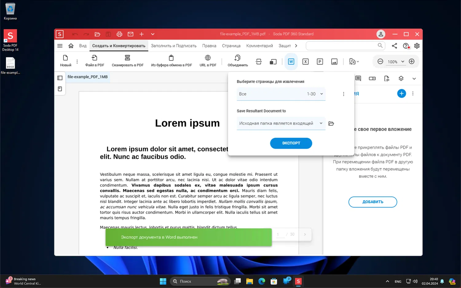 - Конвертация: Эффективно преобразует PDF-документы в другие форматы файлов, такие как Word, Excel, PowerPoint, TXT, HTML, PDF/A или в изображения, и обратно, без потери качества или искажения форматирования оригинального файла.