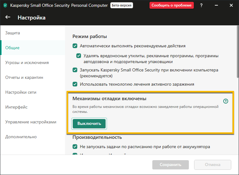 - Перейдите в меню Настройки > Общие и для раздела Механизмы отладки выключены нажмите Выключить.
