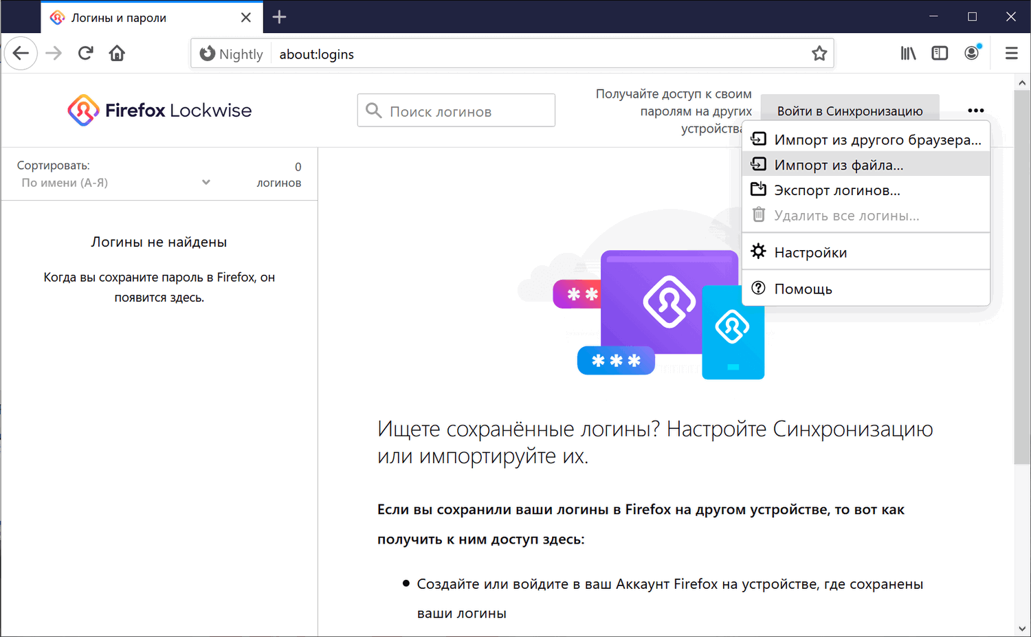 На данный момент Firefox Browser по умолчанию поддерживает две возможности импорта и экспорта паролей. Пользователи Firefox могут импортировать пароли из поддерживаемых браузеров, а именно из классического Microsoft Edge, Microsoft Edge на Chromium, Internet Explorer, Chrome и Chromium-браузеров, а также экспортировать учетные данные в текстовый формат CSV со значениями, разделенными запятой.
