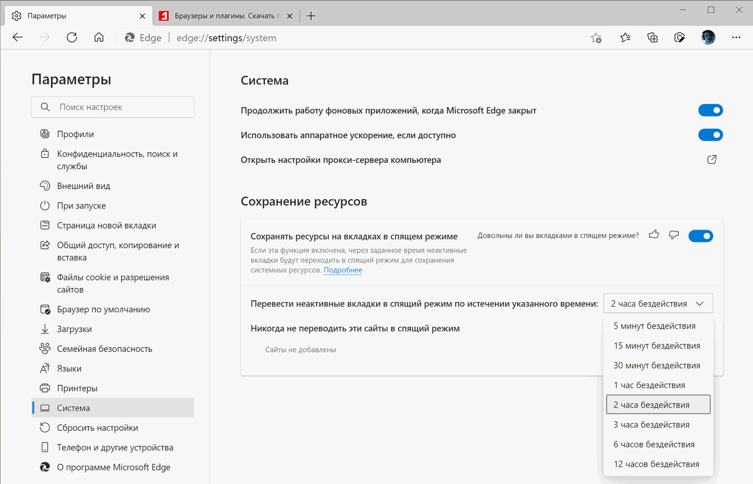 Настройки спящего режима доступны в разделе «Сохранение ресурсов» на странице настроек по адресу: edge://settings/system. Данные параметры доступны, только если включен флаг Tab Sleeping на странице edge://flags.