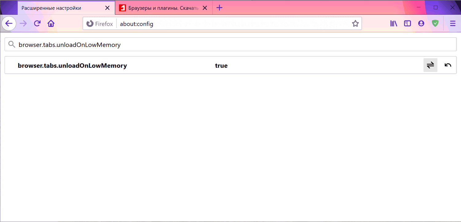 Firefox поддерживает функцию автоматической выгрузки вкладок, которая работает аналогично реализации от Google. По умолчанию функция отключена, ее нужно активировать вручную, установив значение True для параметра browser.tabs.unloadOnLowMemory на странице about:config.