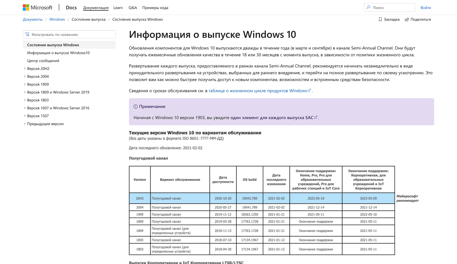 Обновлено: 15.07.2021: Microsoft: Информационный центр «Состояние выпуска Windows» локализован на 10 языков, включая русский.