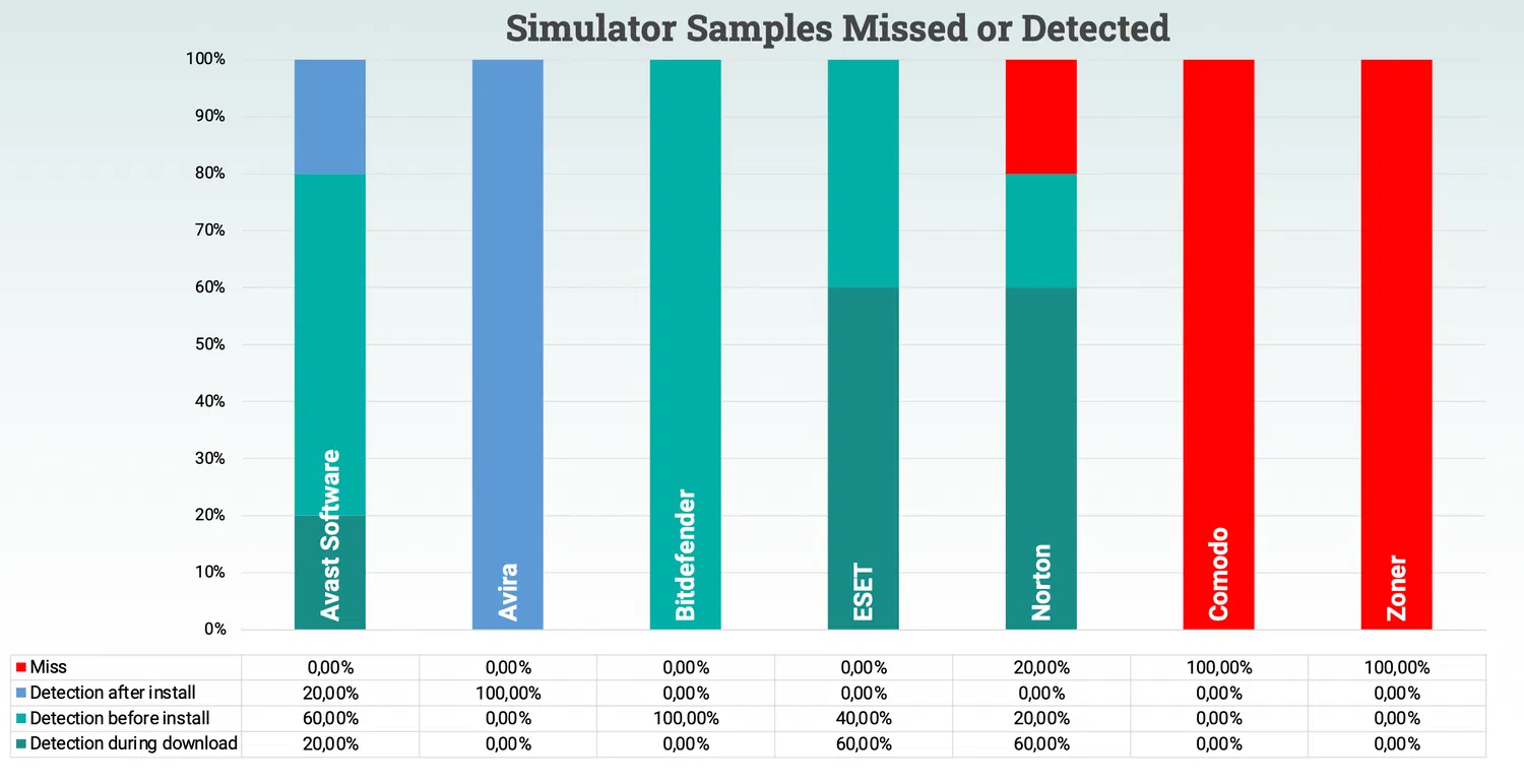 Многие антивирусные движки, которые успешно справились с обнаружением симуляторов в прошлых тестах, на этот раз смогли выполнить обнаружение исключительно на основе признаков сигнатуры пакета. Это означает, что успешное обнаружение было результатом работы механизма, в значительной степени склонного к ложным срабатываниям. Из-за этого в предыдущих раундах тестирования у многих продуктов были проблемы с обнаружением образцов симулятора.