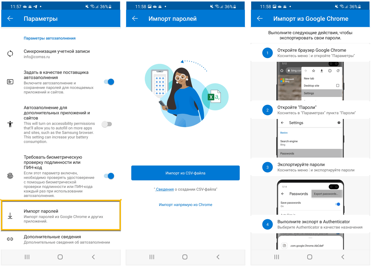 Клиентам нужен простой способ для импорта паролей. В приложении Microsoft Authenticator создана функция импорта, которая позволяет импортировать пароли из Chrome и популярных менеджеров паролей. Также поддерживается импорт паролей из файлов CSV. Ниже показан процесс импорта паролей из Google Chrome на Android.