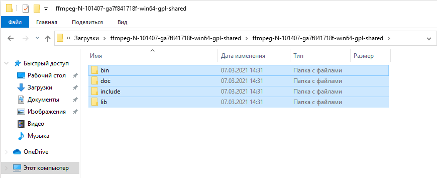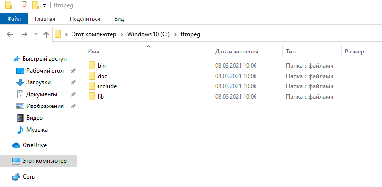 Откройте окно Проводника, перейдите в корень диска «C» и создайте новую папку с именем ffmpeg. Откройте созданную папку и нажмите комбинацию клавиш Ctrl+V, чтобы вставить сюда все скопированные папки FFmpeg.