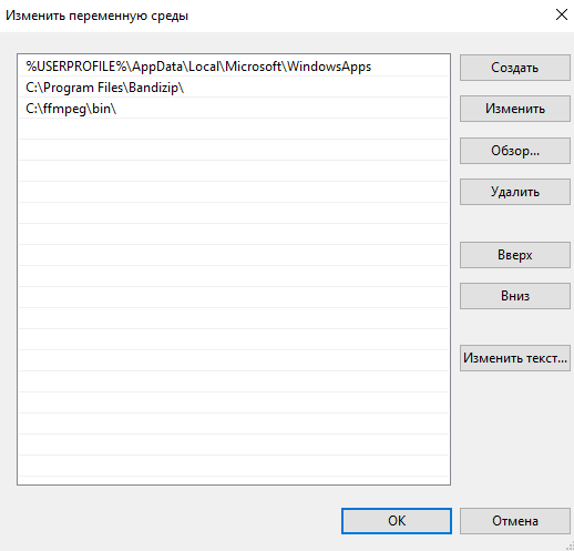В появившемся окне нажмите на кнопку «Создать», в открывшейся строке добавьте расположение папки bin из ffmpeg, затем нажмите на кнопку «OK».