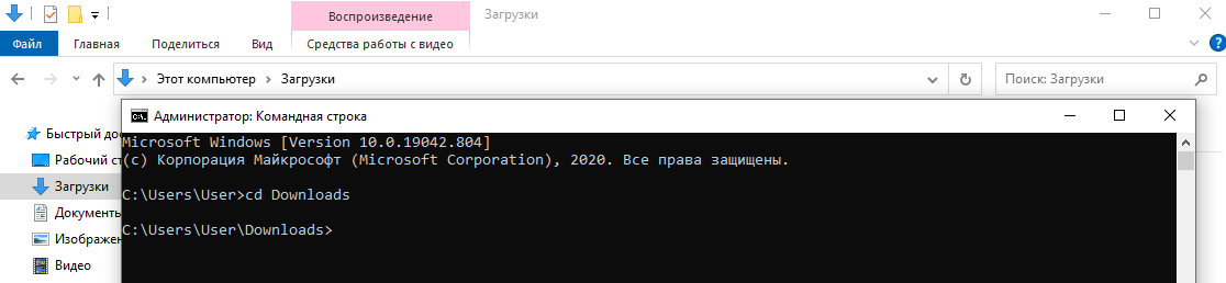 В Командной строке откройте папку «Загрузки» или ту папку, в которой расположено видео.