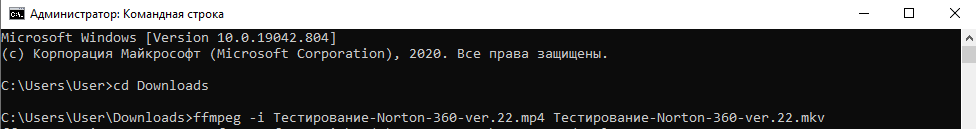 Теперь введите следующую команду, чтобы преобразовать «Тестирование Norton 360 ver. 22.mp4» в «Тестирование Norton 360 ver. 22.mkv». Конечно, замените исходный и целевой файлы в команде, чтобы преобразовать ваши фактические файлы.