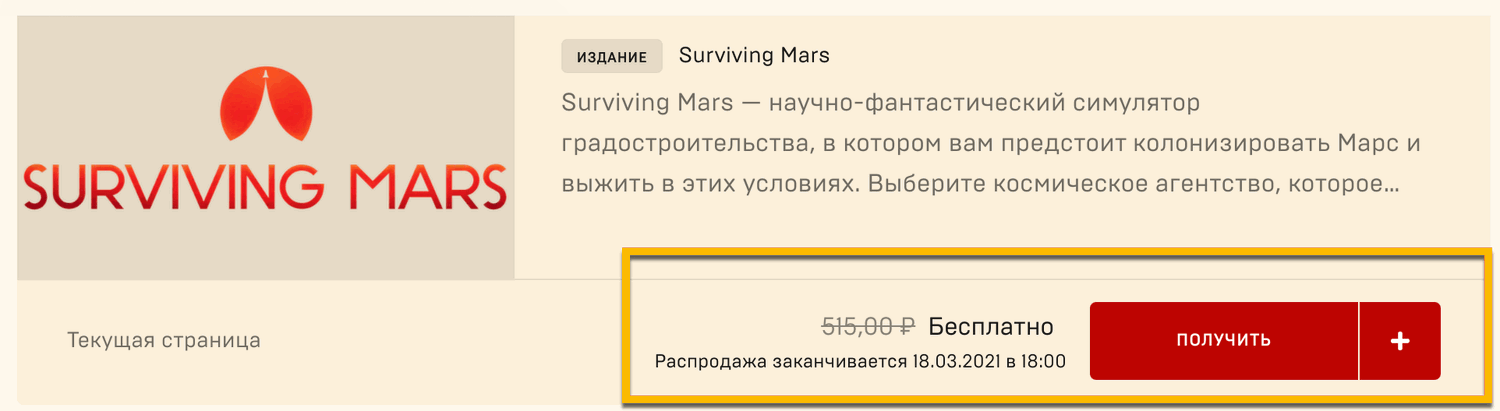 - Перейдите на страницу Surviving Mars. В правом нижнем углу описания игры нажмите на кнопку Посмотреть предложения и выберите Получить для обычного издания «Surviving Mars».