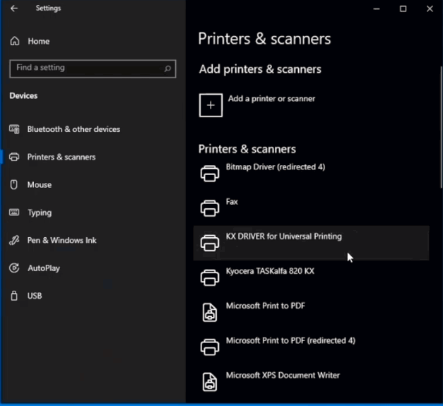 – где KX driver for Universal printing – это название вашего драйвера для принтера. Решение заключается в добавлении атрибута «Direct».