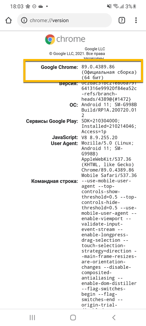 chrome://versionв адресную строку браузера. - В первой записи под названием Google Chrome указан номер версии и архитектура сборки.