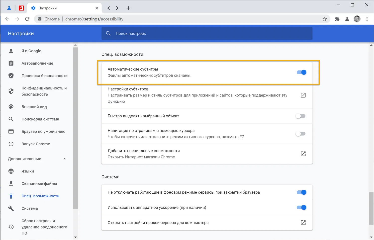 chrome://settings/accessibility - В разделе Спец. возможности найдите опцию Автоматические субтитры и включите ее. Если переключатель стал синего цвета, то функция включена, серый переключатель свидетельствует об отключенной функции.