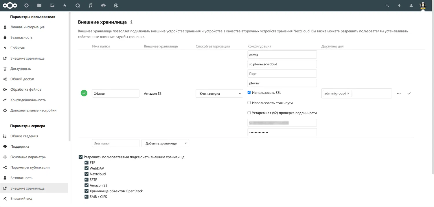 Кроме того, с помощью редактирования конфигурационного файла Nextcloud можно подключить облачное хранилище S3 в качестве основного хранилища. Однако, судя по комментариям, оба варианта имеют некоторые недостатки. Поэтому рассмотрим вариант использования облачного хранилища S3 в качестве файловой системы для Nextcloud.