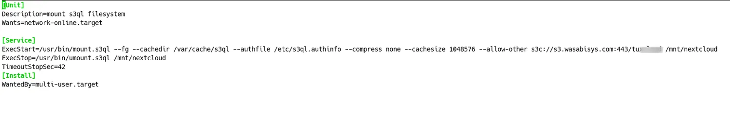 mount.s3ql s3c://s3.wasabisys.com:443/<BUCKET-NAME> /mnt/nextcloud