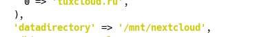 ... 'datadirectory' => '/mnt/nextcloud', ... и ниже: [...] 'logfile' => '/mnt/nextcloud/nextcloud.log', [...]