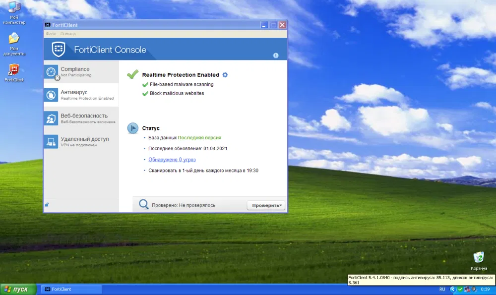 FortiClient - бесплатный антивирус, включающий веб-фильтр и родительский контроль. Новые версии антивируса не поддерживают Windows XP - последняя версия FortiClient с поддержкой Windows XP это FortiClient 5.4.1. После установки, вирусные базы успешно обновились.
