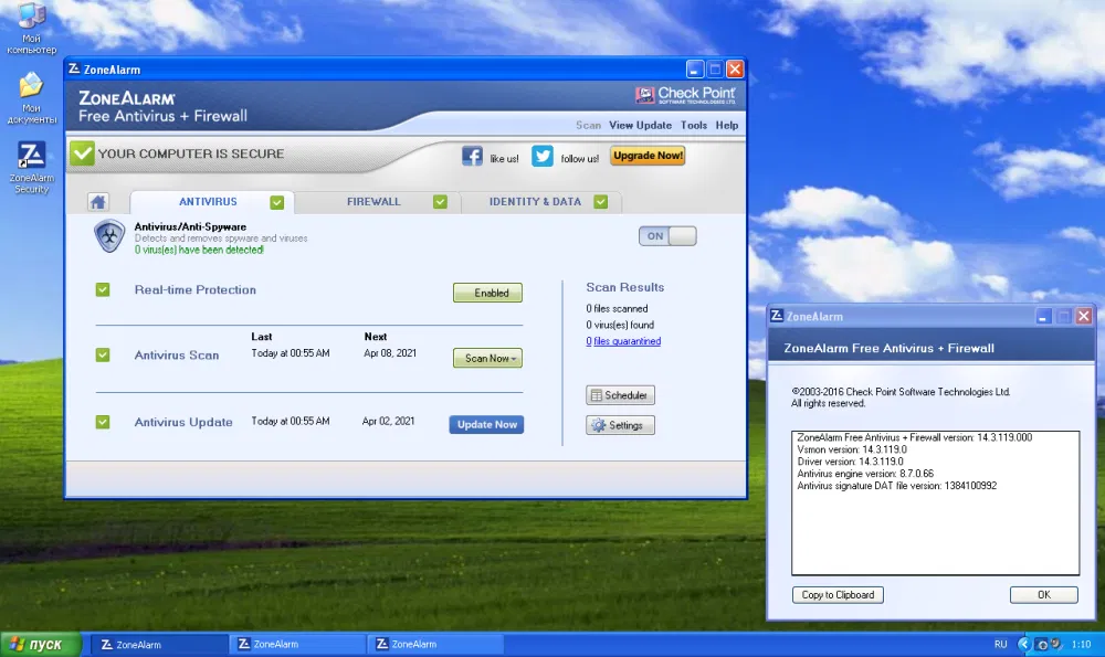 Комплексный антивирус ZoneAlarm Free Antivirus + Firewall включает антивирусную защиту, сетевой экран и контроль программ. В прошлом году разработчики сообщили о прекращении поддержки Windows XP. Последней поддерживаемой версией является 14.3.119.0 - она будет и дольше получать обновления вирусных баз.