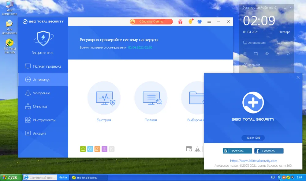 Антивирус 360 Total Security обеспечивает не только защиту от вирусов и вредоносных программ, но и включает функции оптимизации и ускорения системы. Разработчики ещё не отказались от поддержки Windows XP, поэтому пользователи этой системы могут установить новейшую версию антивируса и получать регулярные обновления.