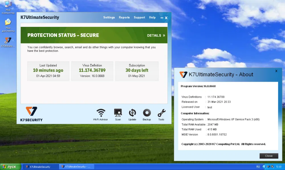 Комплексное антивирусное решение K7 Ultimate Security включает антивирус, интернет-защиту, сетевой экран, родительский контроль и функцию резервного копирования. Поддержка Windows XP заявлена в системных требованиях на официальном сайте. После установки, антивирус обновил вирусные базы до новейшей версии.