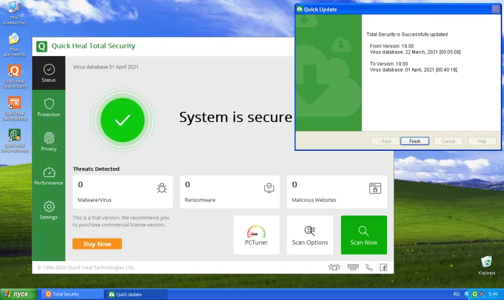 Комплексное антивирусное решение Quick Heal Total Security официально продолжает поддержку Windows XP. После установки, антивирус обновил вирусные базы до новейшей версии.