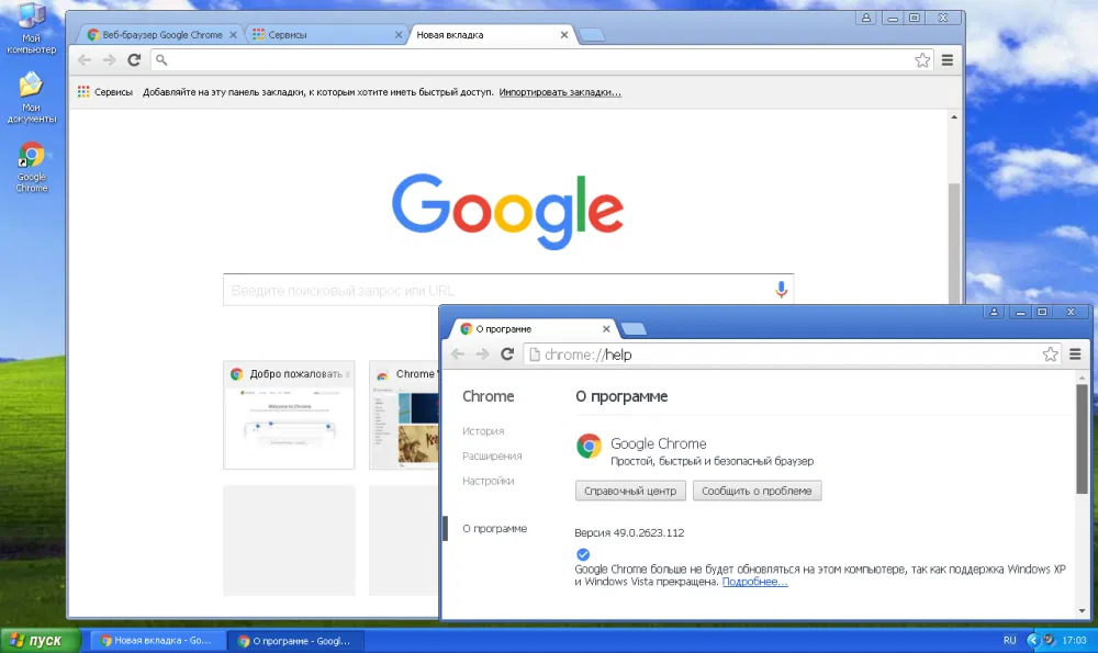 Самый популярный интернет-браузер на базе движка Chromium завершил поддержку Windows XP в 2016 году. Последняя версия, которую могут установить пользователи этой системы - Google Chrome 49.0.2623.112.