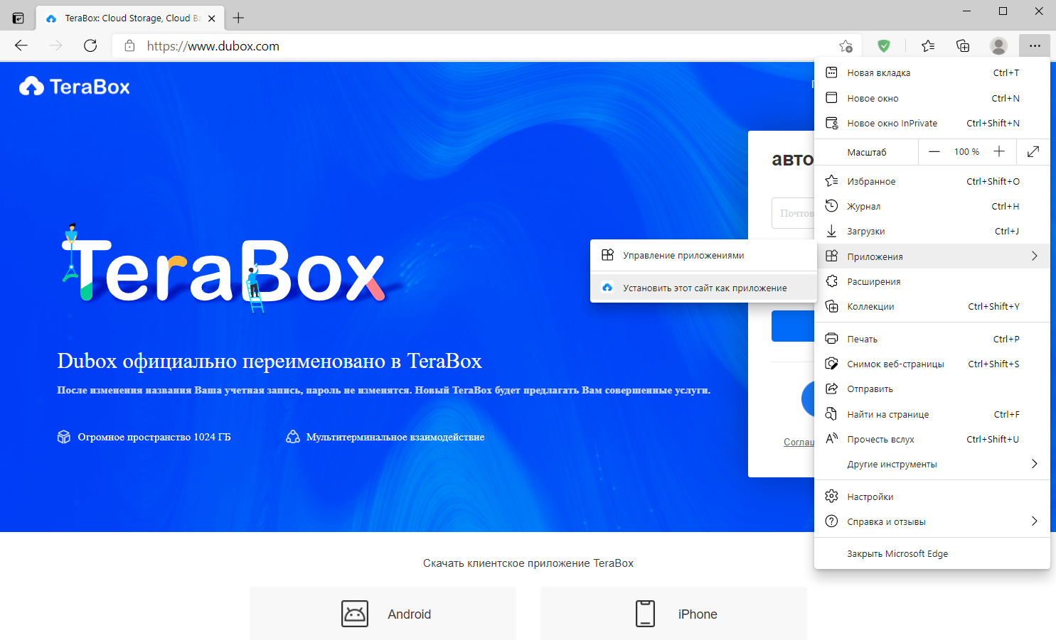 Конвертировать сайт в прогрессивное приложение максимально просто. В данном примере мы конвертируем веб-сайт Dubox (сервис TeraBox) в прогрессивное приложение для Windows.