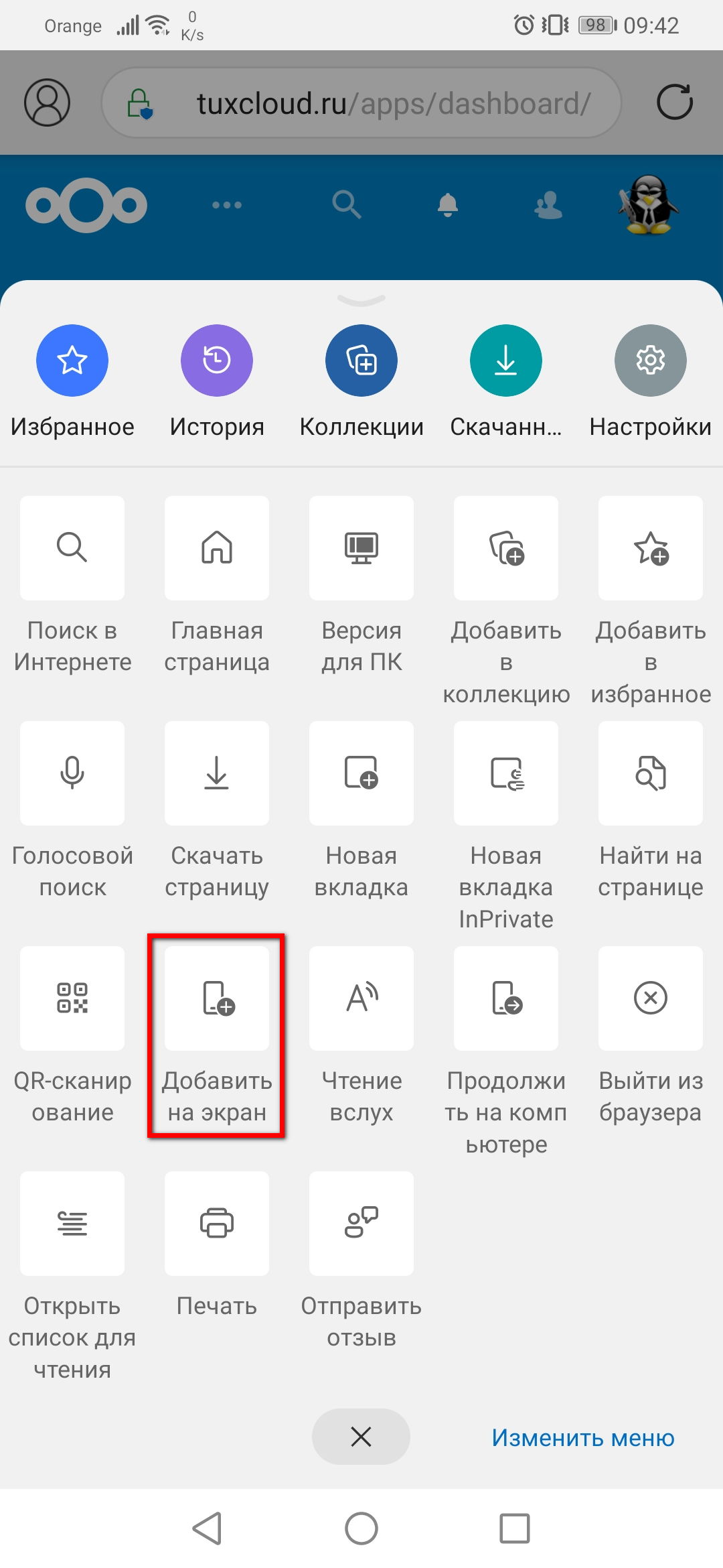 - В зависимости от используемого браузера, расположение настроек или их название может отличаться. В большинстве случаев функция конвертации будет называться «Добавить на экран» или «Установить приложение». Нажмите на данную кнопку.
