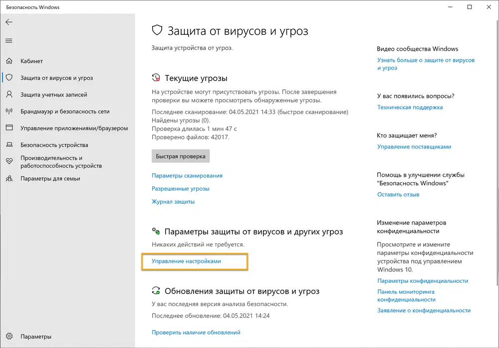 - На открывшемся экране выберите опцию Управление настройками в секции Параметры защиты от вирусов и угроз.