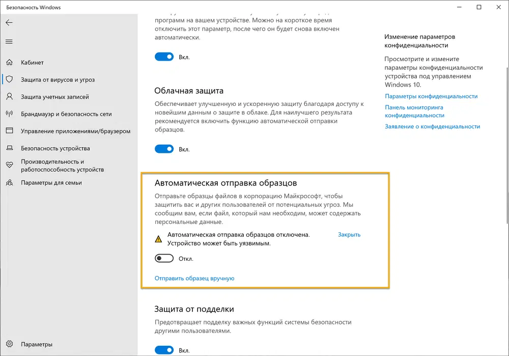 Как отключить функцию «Автоматическая отправка образцов» в Microsoft Defender?