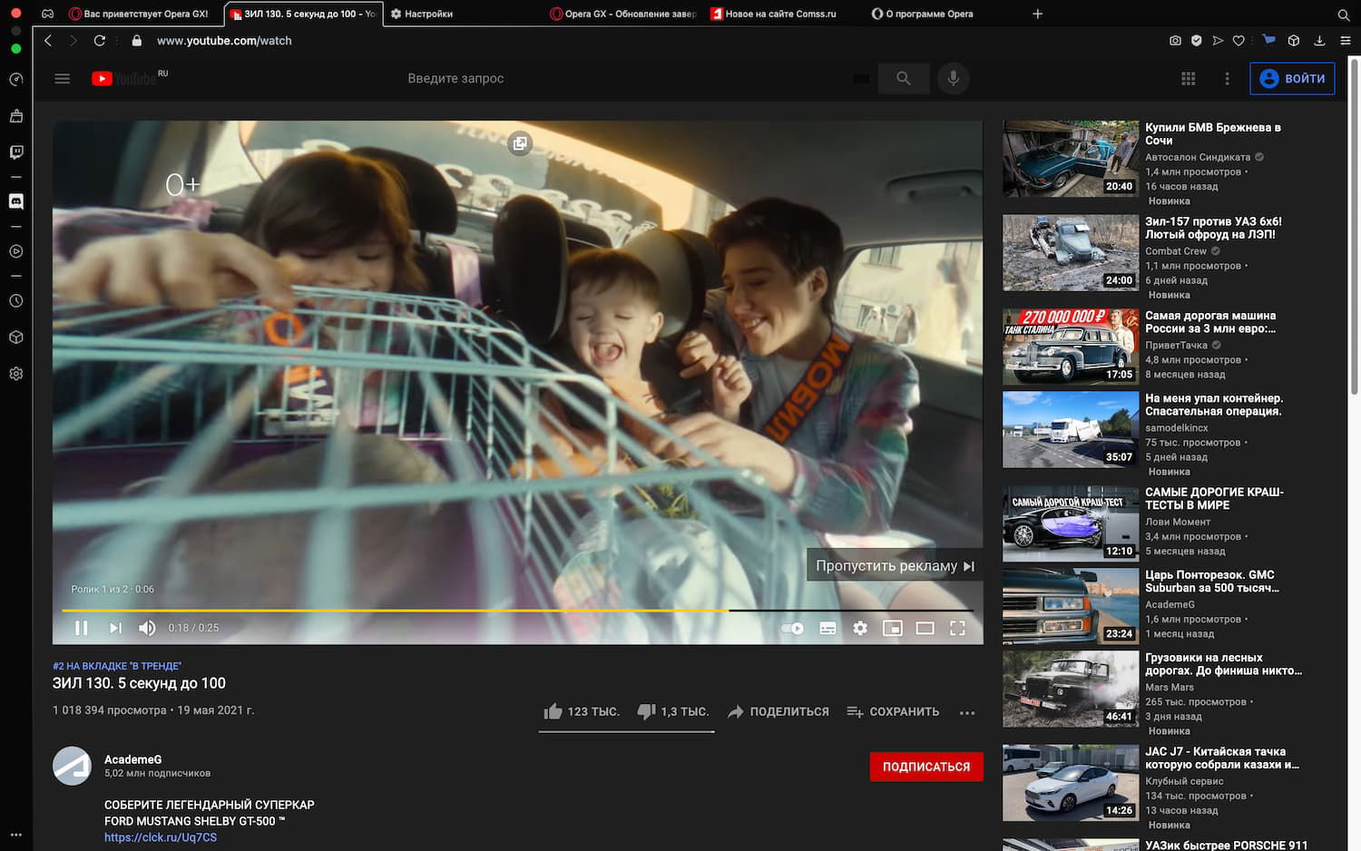 Во время тестирования Opera GX не заблокировал 9 из 10 рекламных вставок. При переключении роликов почти в каждом видео показывается реклама, но в некоторых видео она отсутствовала. Складывается впечатление, что показ рекламы зависит от конкретного канала. Рекламные ролики не показывались на каналах крупных брендов, которые используются скорее в маркетинговых целях, а не для монетизации.