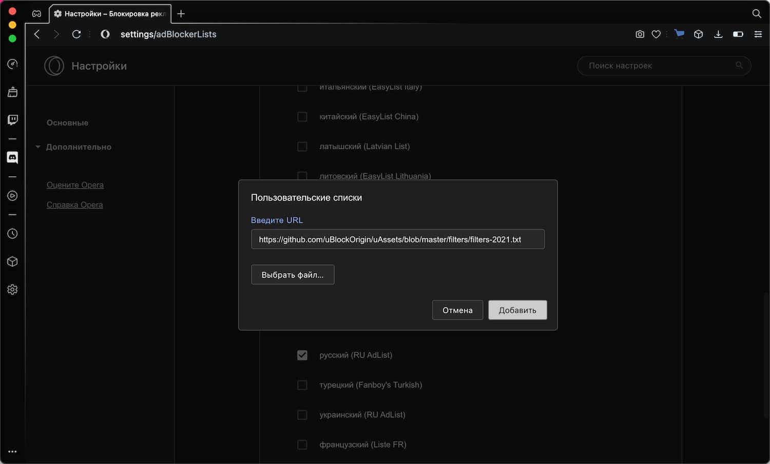 Второй вариант — добавить свои списки фильтров, в этом случае вам не придется устанавливать дополнительные расширения. В Git-репозитории uBlockOrigins uAssets собраны фильтры, которые вы можете добавить в Opera. Просто скопируйте URL-адрес каждого списка и вставьте его в раздел Пользовательские списки в настройках Opera (opera://settings/adBlockerLists).