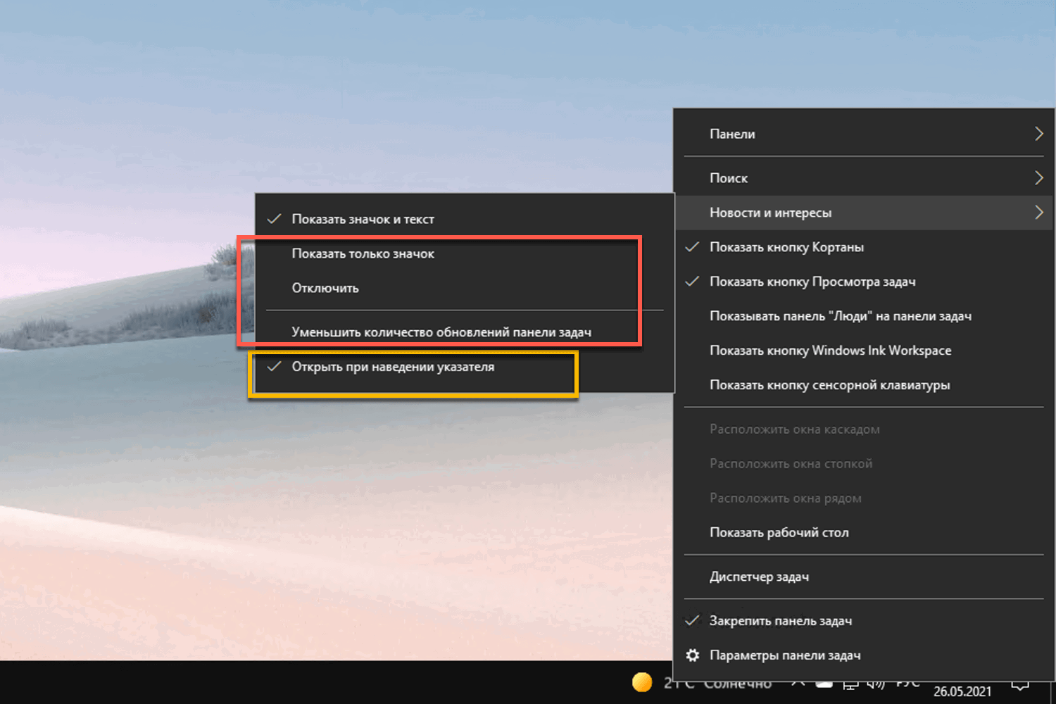 - Щелкните правой кнопкой по значку «Новости и интересы» на панели задач Windows 10.