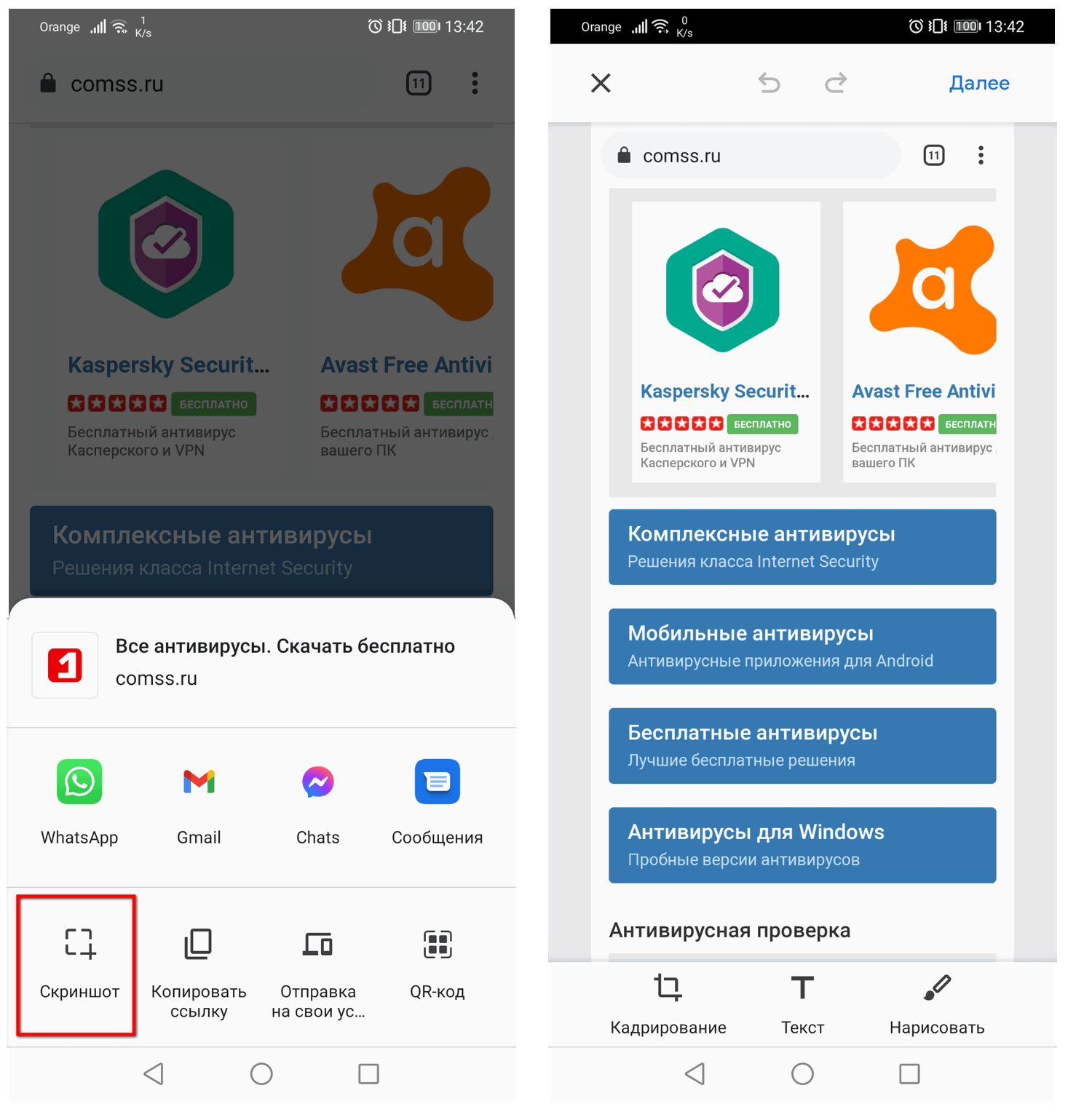 А каким мобильным браузером вы пользуетесь? В нем есть инструмент для создания и редактирования скриншотов?