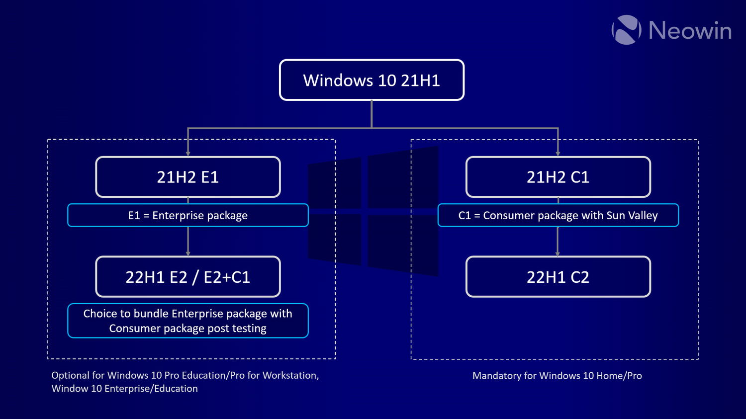 Компания может также включить код, необходимый для активации Sun Valley в пакет обновления 21H2. Однако, применение изменений может происходить с помощью комбинации активационного пакета и пакета Feature Experience Pack для потребителей. Предприятиям Microsoft может предложить вариант установки пакета Enterprise с исправлениями ошибок, улучшениями производительности и другими изменениями, но без включения Sun Valley и отвечающего за изменение интерфейса кода. Ниже представлена схема работы данной концепции.