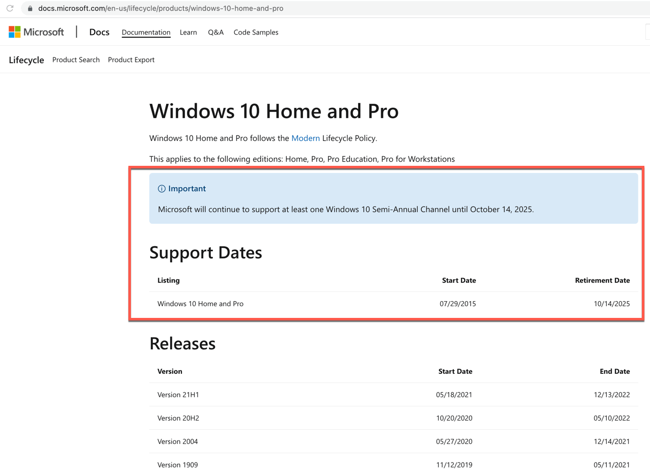 Майкрософт будет продолжать поддерживать по крайней мере один полугодовой канал Windows 10 до 14 октября 2025 года.