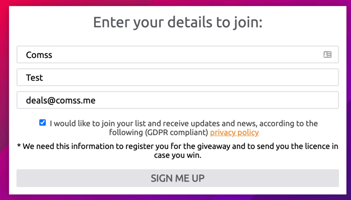 2. Заполните форму вашими данными: укажите имя, фамилию и адрес электронной почты, и нажмите кнопку SIGN ME UP.