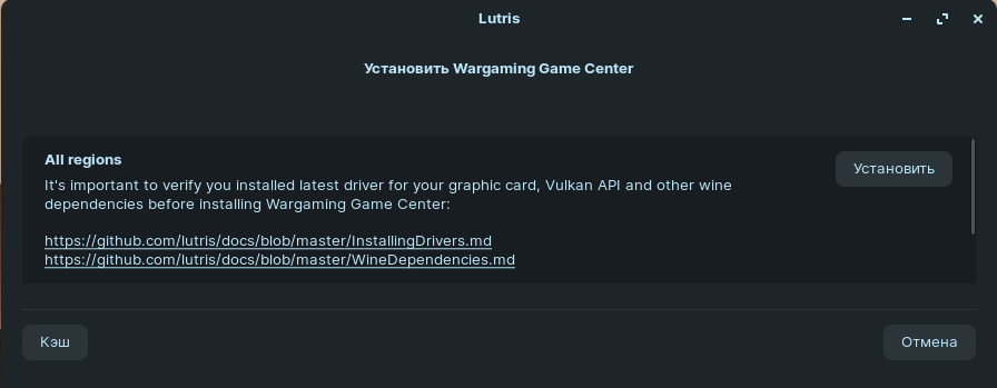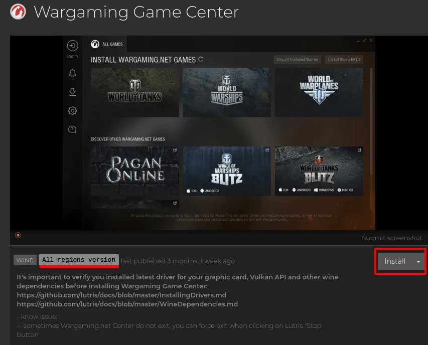 Для установки лаунчера Wargaming Game Center переходим на соответствующую страницу сайта программы Lutris. Выбираем скрипт установки лаунчера нужного нам региона. Например, All regions version и нажимаем на кнопку Install.