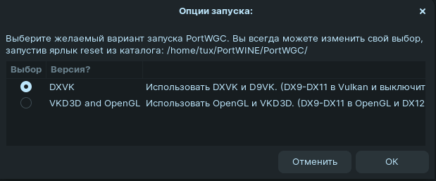 По умолчанию порт устанавливается в директорию ~/PortWINE/PortWGC, там же доступны ярлыки для запуска лаунчера и сброса настроек порта.