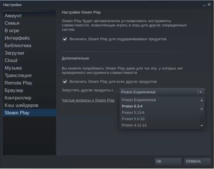 Имейте в виду, что в случае проблем с запуском игры вам стоит сменить версию Proton в настройках Steam Play.