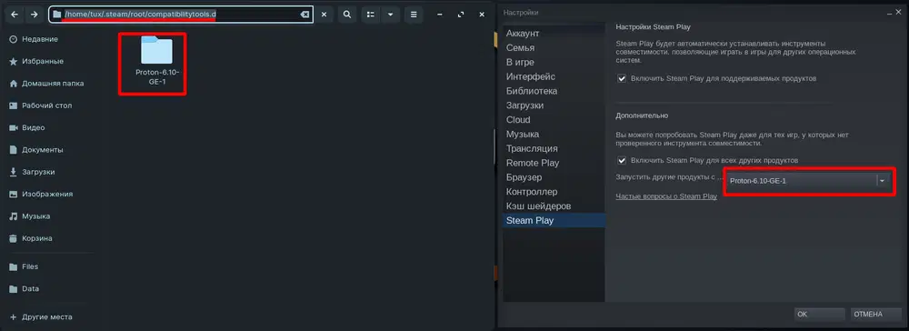 - Папку Proton-xxx-GE-x, архив которой мы скачали, переносим в папку ~/.steam/root/compatibilitytools.d/.