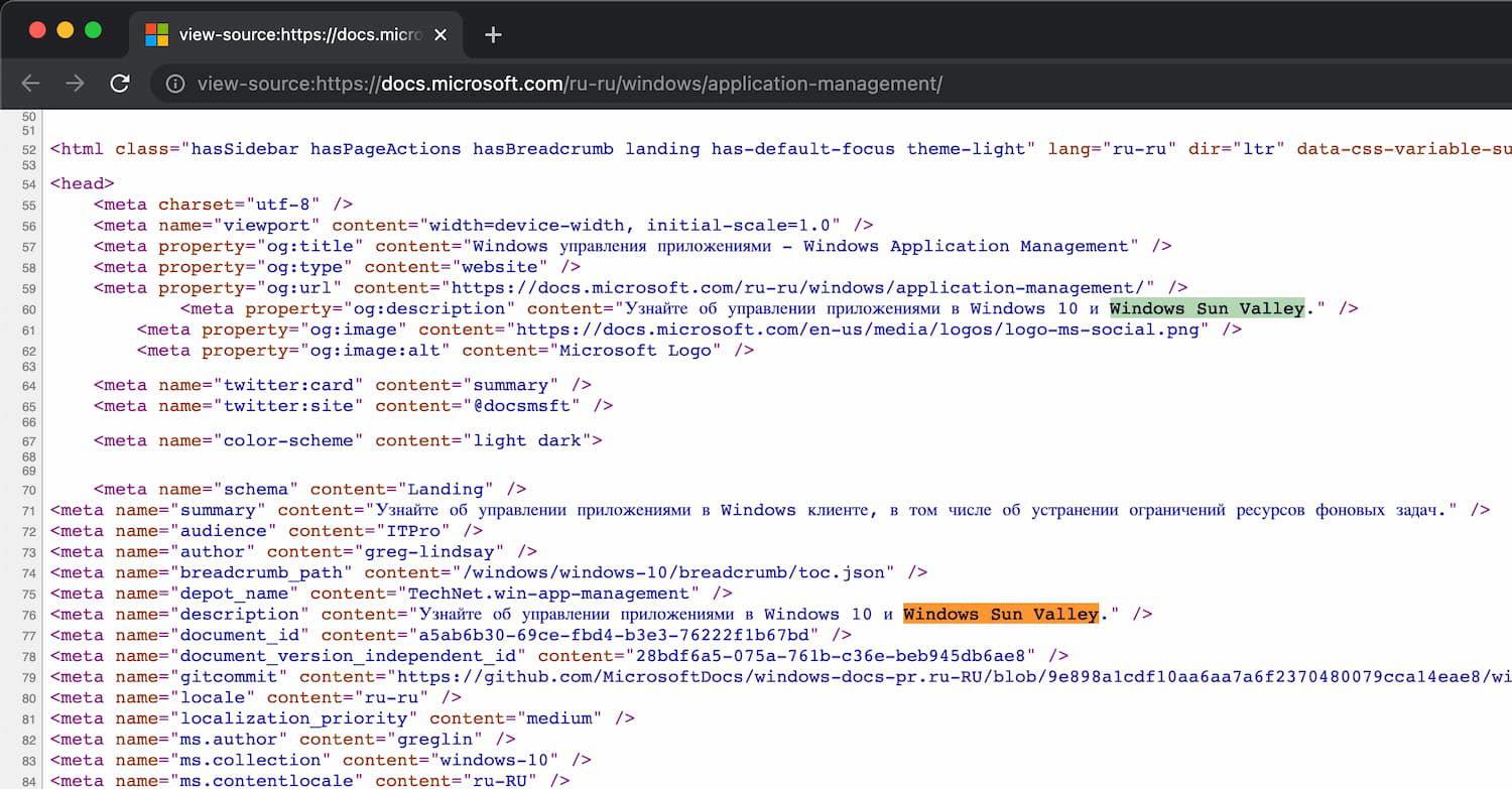 Интересно, что в руcскоязычной версии страницы «Управление приложениями Windows» упоминание «Windows Sun Valley» по-прежнему присутствует в исходном HTML-коде.