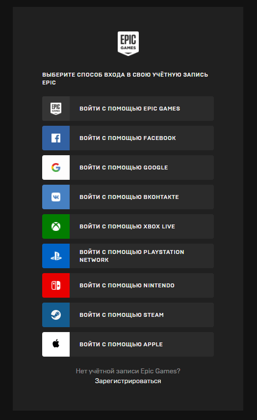 - Если у вас отсутствует аккаунт цифрового магазина Epic Games Store, то выполните регистрацию любым из перечисленных способов.