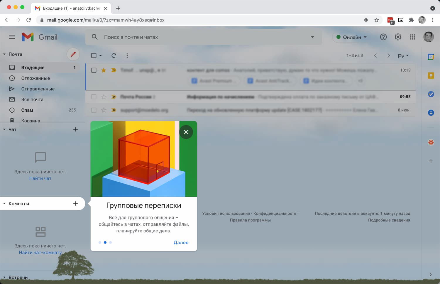 Новый интерфейс Gmail будет загружен сразу после сохранения изменений. В боковой панели ниже почтовых папок появятся разделы Чат, Комнаты и Встречи.