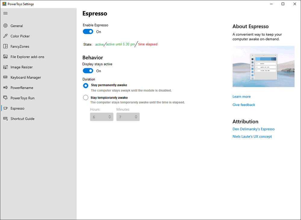 Awake, ранее называвшийся Espresso, — это новый инструмент, который скоро будет интегрирован в коллекцию. Пользователи Windows могут использовать сторонние решения, чтобы предотвратить переход ПК в спящий режим, например Caffeine, Sleep Blocker, Don't Sleep, или Stand-Bye.