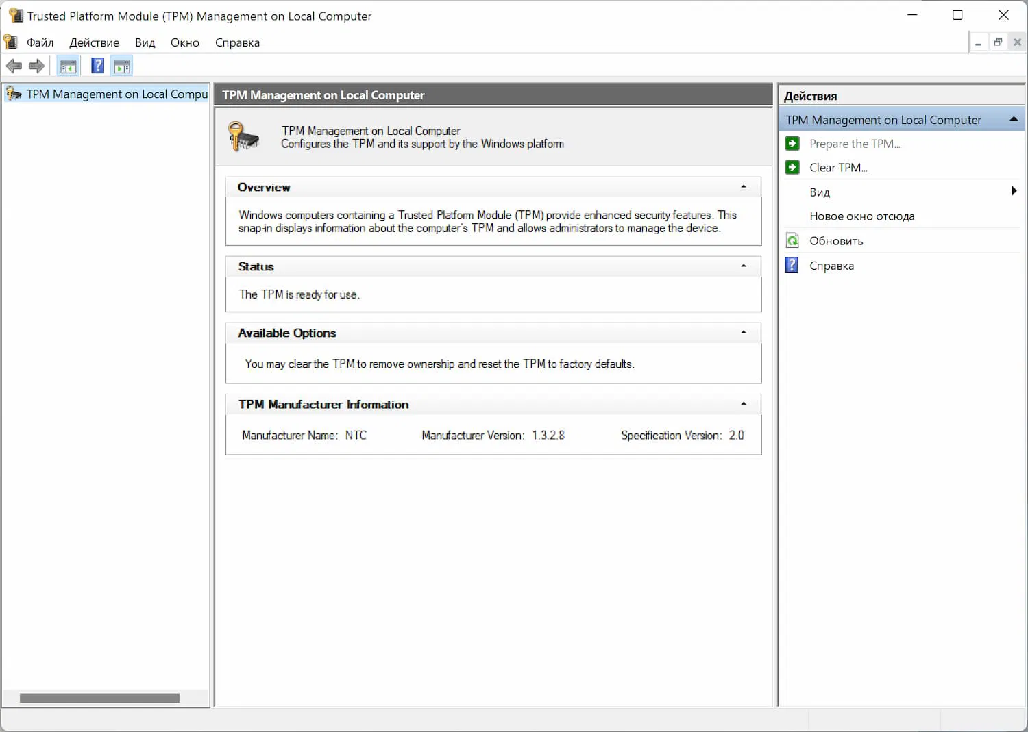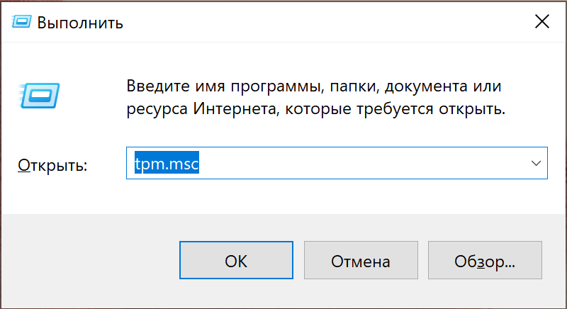 - Введите tpm.msc и нажмите ОК. Должна открыться консоль «Управление доверенным платформенным модулем (TPM) на локальном компьютере».