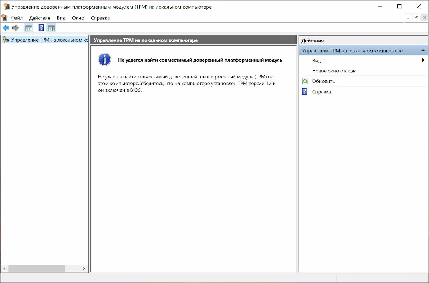 Если данная секция панели не отображается и вы получаете ошибку «Не удается найти совместимый доверенный платформенный модуль», то микросхема TPM отсутствует на материнской плате устройства или отключена в BIOS.