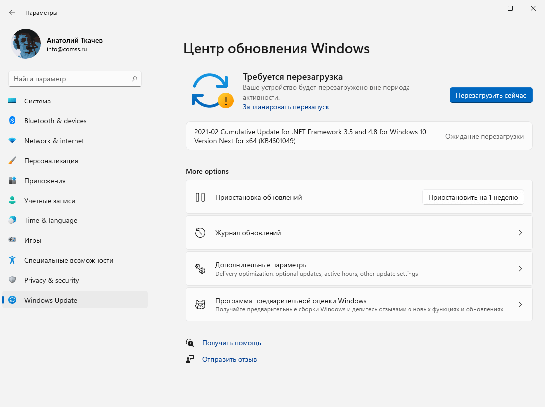 Она имеет круглую желтую метку и всплывающую подсказку, которая сообщает о необходимости перезагрузить ПК для установки обновлений. При клике по иконке открывается экран Центра обновления Windows, который получит полезную новую функцию — отображение ожидаемого времени установки. На скриншоте видно, что установка обновления, по оценкам Windows 11, займет около 5 минут.