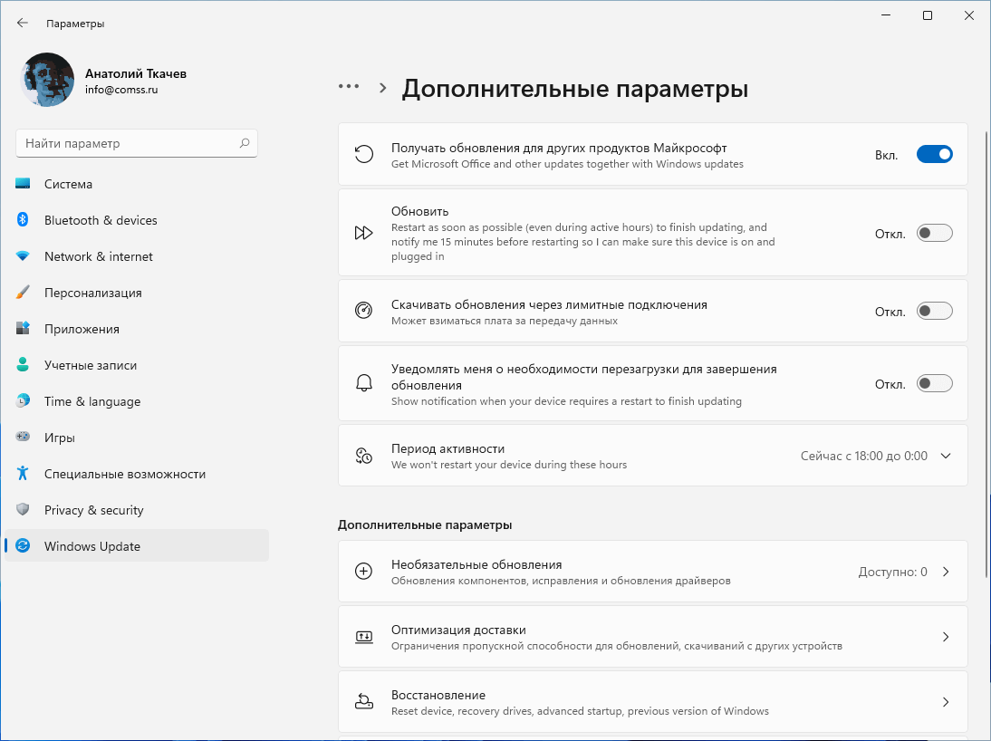 Что касается настроек Центра обновления Windows 11, то изменений не так много. Макет страницы основных параметров немного отличается от Windows 10. Вы по-прежнему можете приостановить обновления на 7 дней (1 неделю), пока участвуете в программе предварительной оценки Windows Insider. Оптимизация доставки включена по умолчанию, но вы можете изменить ее статус на странице дополнительных параметров.